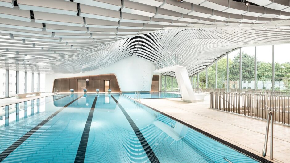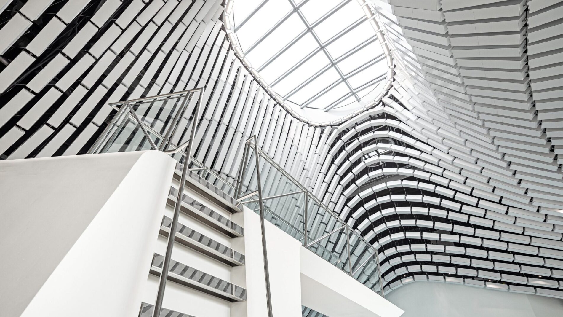 The urban building is characterized by the highest level of creative quality and functionality. The shell of ceramics and glass reflects the elegant shapes of the water. The ceramic slats on the facade not only provide protection from prying eyes, but also round off the overall appearance of the building. The special ceiling design in the open panorama level is a head-turner for every visitor.