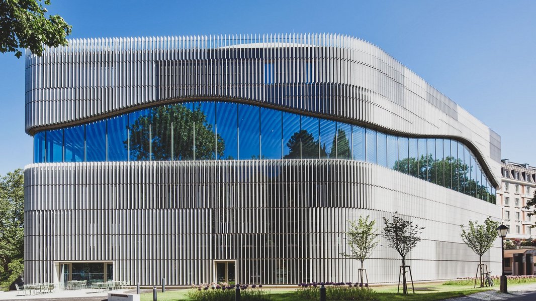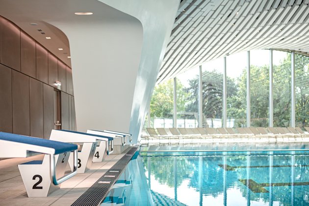 Das urbane Gebäude zeichnet sich durch höchste gestalterische Qualität und Funktionalität aus. Die Hülle aus Keramik und Glas spiegelt die eleganten Formen des Wassers wider. Die Keramiklamellen an der Fassade schützen nicht nur vor neugierigen Blicken, sondern runden das Gesamtbild des Gebäudes ab. Die besondere Deckengestaltung in der offenen Panoramaebene versetzt jeden Besucher ins Staunen.